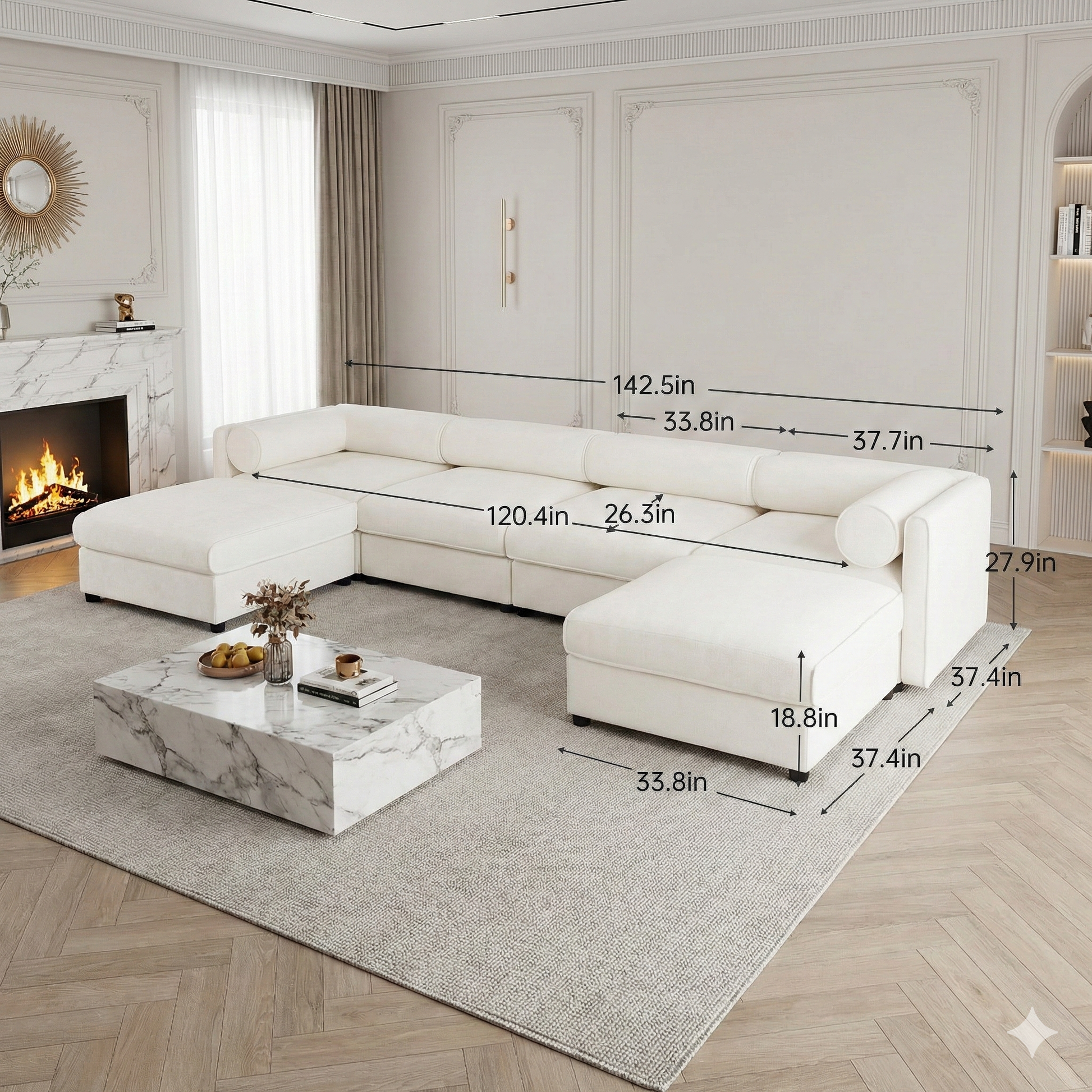 Upholstered in soft white chenille, this four-seat modular sofa presents a calm, inviting presence with a quietly refined character. The fabric’s plush texture offers both comfort and durability, lending a gentle elegance that suits everyday living while remaining easy to care for.