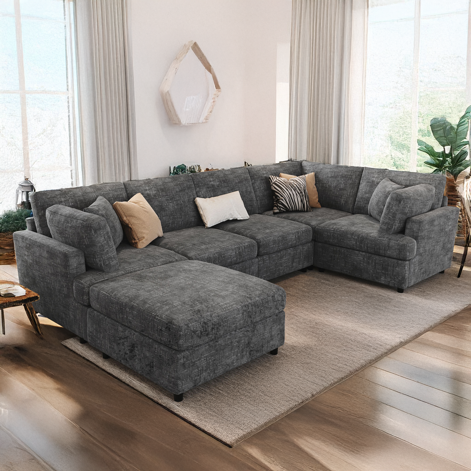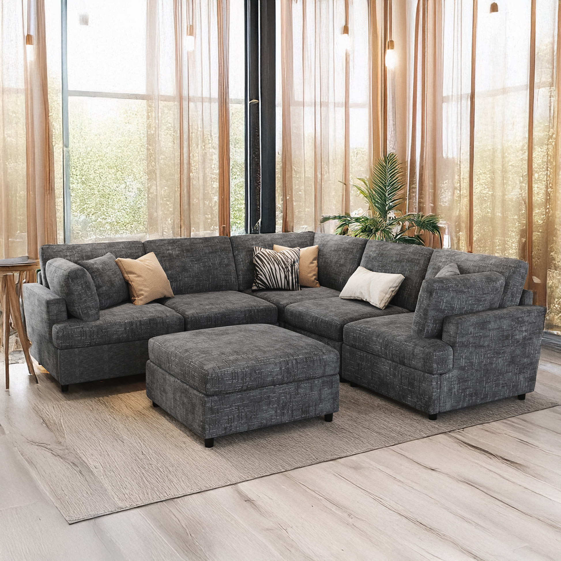 The sectional is composed of six detachable modules that may be arranged to suit the room, shifting easily between a U-shape, an L-shape, a chaise configuration, or separate seating. A movable ottoman extends the layout when desired, serving as a footrest, an extra seat, or a low surface. This flexibility allows the arrangement to adapt naturally to gatherings, quiet evenings, or changes in the space itself.