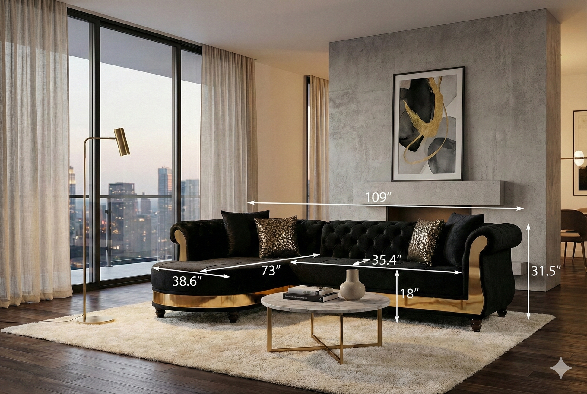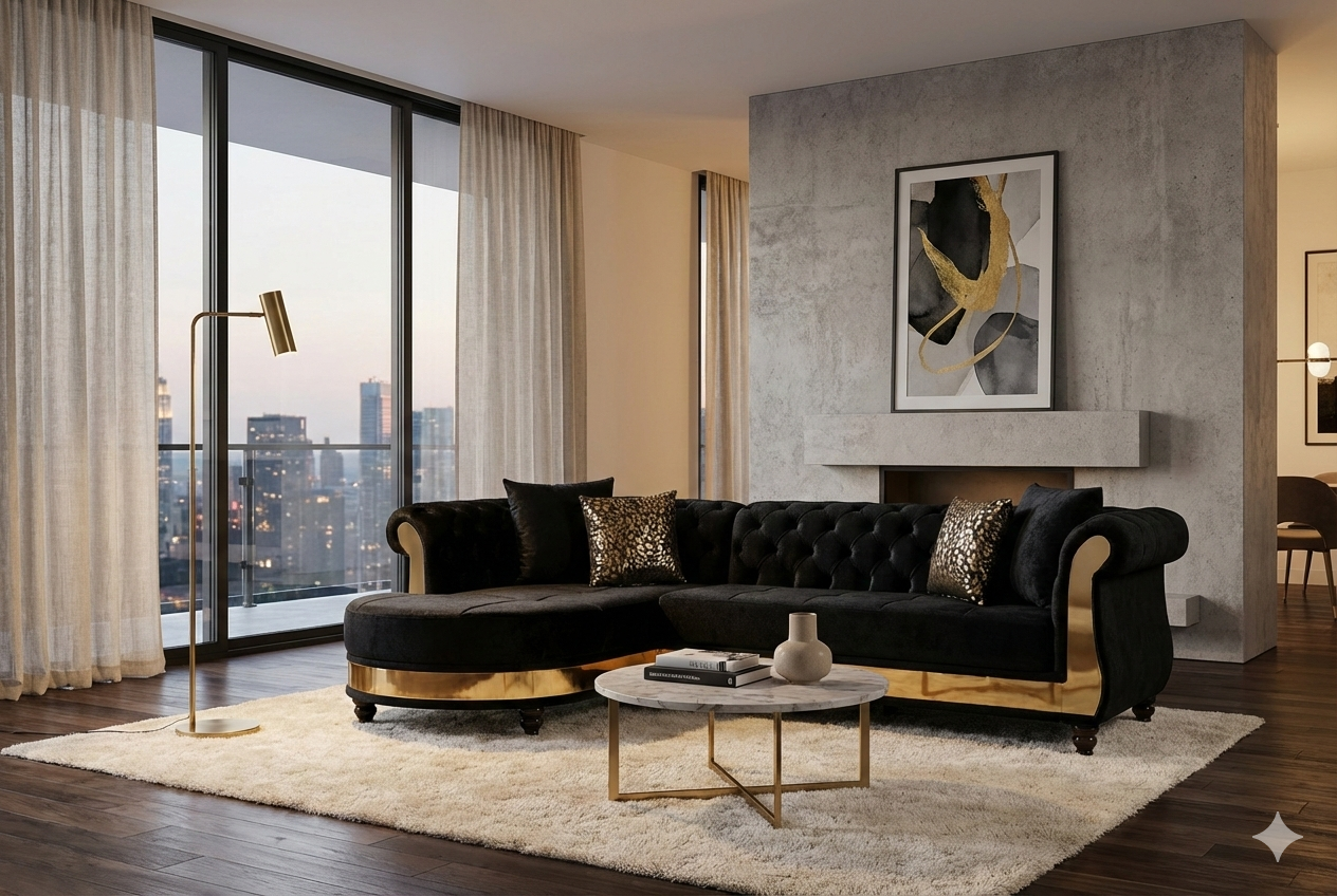 Dressed in rich black velvet, this six-seat L-shaped sectional presents a striking blend of modern sophistication and inviting comfort. The deep, lustrous upholstery creates a bold focal point, while its clean, sculpted profile allows it to integrate seamlessly into contemporary and modern living spaces.