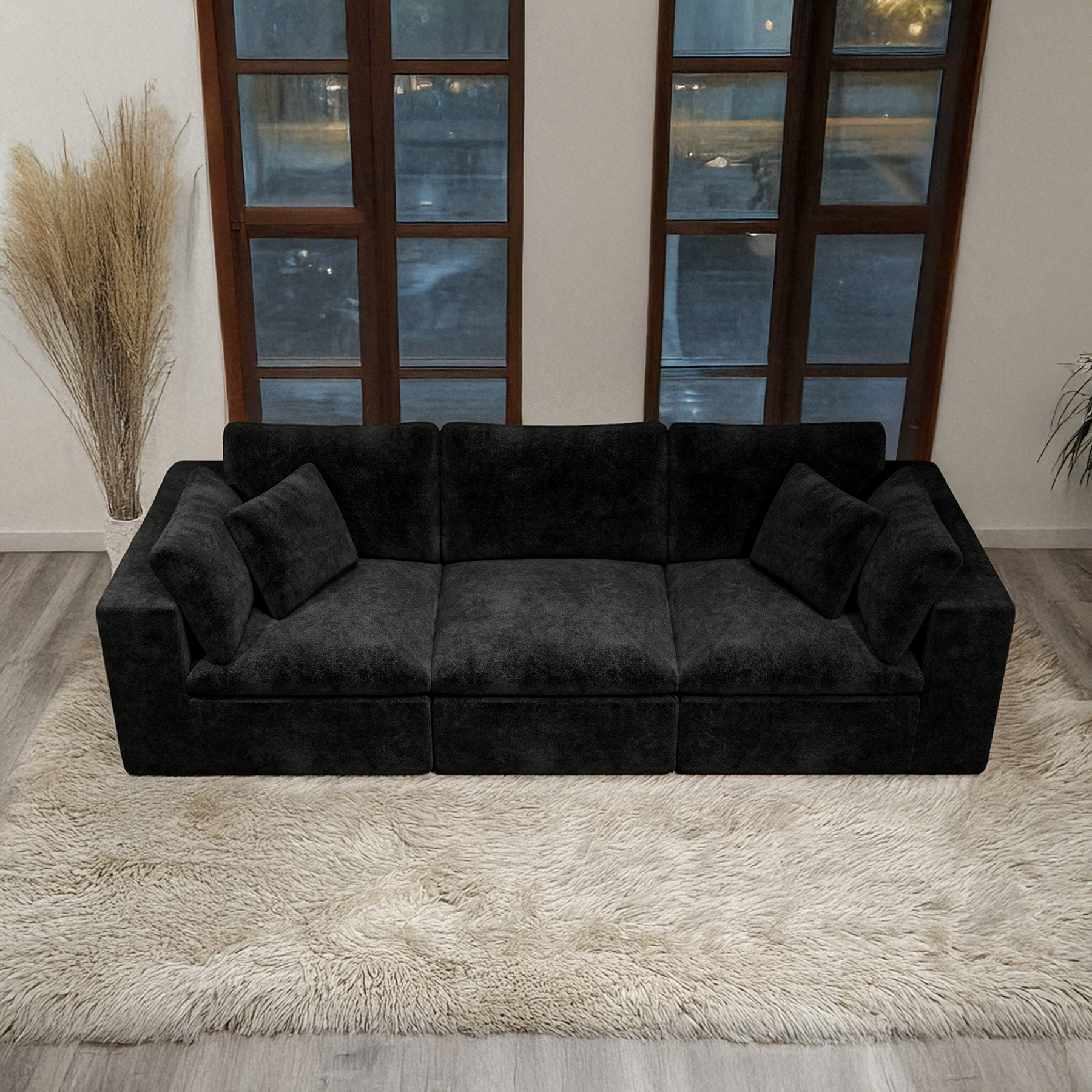 In black corduroy, this modular sectional brings a calm, measured presence to a living space, extending 108.3 inches (9.025 feet) in length. Its clean-lined form and relaxed silhouette allow it to settle comfortably along a wall or within a corner, making it well suited to apartments, bedrooms, and thoughtfully proportioned living rooms.