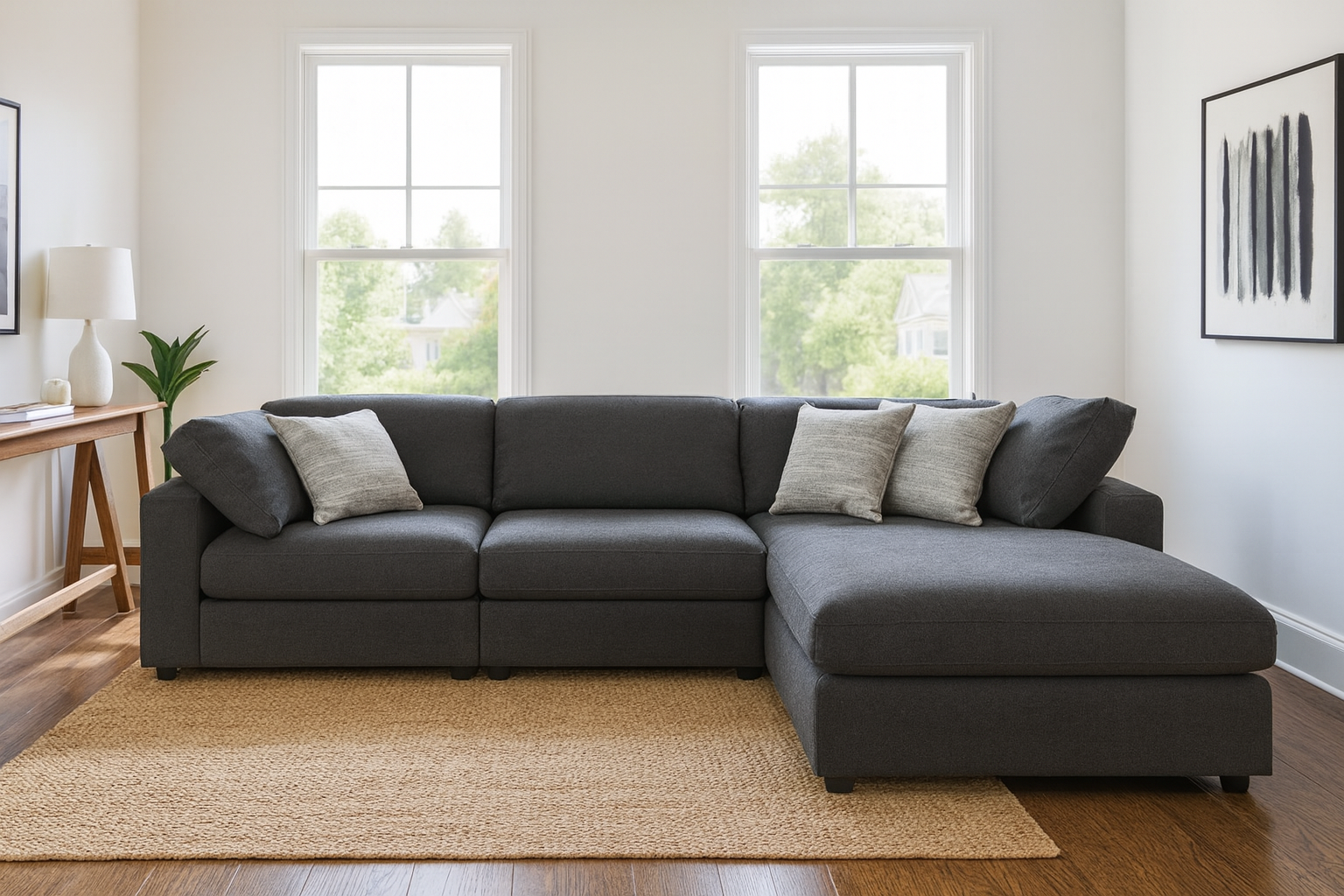 Wrapped in a breathable linen-like fabric with a soft, inviting texture, the sectional’s neutral hue creates a serene backdrop for relaxation. Jacquard accent pillows add subtle texture and visual interest, complementing the reversible back and seat cushions for both style and easy maintenance.